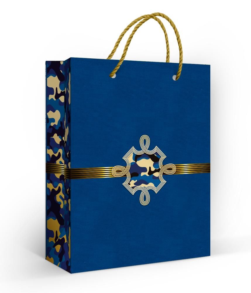 Пакет бумажный подарочный формата MS изготовлен из мелованной бумаги с матовой ламинацией, что повышает износостойкость поверхности, устойчивость к истиранию и придаёт изделию аккуратный внешний вид при многократном контакте в процессе транспортировки и выкладки. Габариты готового изделия составляют 180 мм по длине и 135 мм по ширине, высота подобрана для размещения типовых подарков среднего формата: парфюмерии, аксессуаров, небольших наборов, текстиля, канцелярии и сувенирной продукции. Конструкция усилена за счёт плотного донышка и проклеенных боковых сгибов, что обеспечивает стабильную форму пакета при нагрузке и позволяет рационально использовать его в розничных магазинах, сувенирных отделах и интернет-логистике. Ручки-шнуры выполнены из скрученного синтетического материала, пропущены через отверстия и зафиксированы изнутри, что снижает риск разрыва при переноске и удобно при выдаче покупок. Внешнее оформление сочетает однотонный синий фон с камуфляжным рисунком по бокам и центральным декоративным элементом с золотистыми линиями, за счёт чего пакет подходит для нейтральных и мужских подарков, корпоративных наборов, упаковки к профессиональным праздникам и памятным мероприятиям. Внутренняя поверхность без текста и дополнительной печати, что облегчает использование пакета в разных торговых концепциях и не конфликтует с фирменным стилем заказчика; при необходимости внутрь можно вкладывать брендированные вкладыши, полиграфию или рекламные материалы. Пакеты поставляются по 10 штук, удобны для оптового и розничного складского учёта, компактно штабелируются, не деформируются при правильном хранении и позволяют формировать однородный ассортимент упаковки в магазинах одежды, подарков, салонах услуг и при проведении промо-акций.