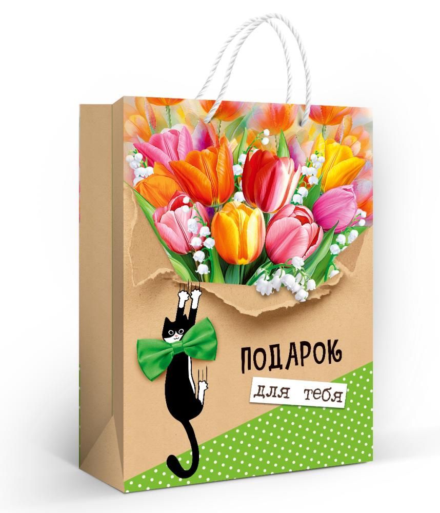 Пакет бумажный подарочный формата ML изготовлен из плотной мелованной бумаги и рассчитан на упаковку средних по размеру подарков и сувенирной продукции. Материал обладает достаточной жесткостью, хорошо держит форму и выдерживает стандартные нагрузки при розничной и оптовой выдаче покупок. Размер готового изделия 310 × 220 мм обеспечивает размещение коробок с косметикой, текстиля, небольших игрушек, канцелярских наборов и других товаров аналогичного габарита, что удобно при формировании унифицированного ассортимента упаковки для магазинов и служб доставки. Внешняя поверхность оформлена цветным изображением букета тюльпанов и ландышей с декоративным рисунком кота и надписью «Подарок для тебя», что делает пакет уместным для поздравлений к дню рождения, 8 Марта, профессиональным и семейным праздникам, а также для корпоративных мероприятий. Матовая ламинация защищает печать от истирания, придает поверхности аккуратный внешний вид, снижает риск появления заломов и обеспечивает устойчивость к влаге при кратковременном контакте. Конструкция с шнуровыми ручками рассчитана на многократное использование, удобна для переноски и не деформирует края пакета при нагрузке в пределах рекомендуемой для данного формата. Внутренняя сторона без текста и дополнительных элементов, что позволяет использовать пакет в различных сценариях дарения без привязки к конкретному событию и упрощает хранение в складской программе. Поставка осуществляется по 10 штук, что удобно для оптовых закупок, планирования витринной выкладки и поддержания стабильного запаса упаковочных материалов в розничных точках, интернет-магазинах и сервисах подарочной упаковки.