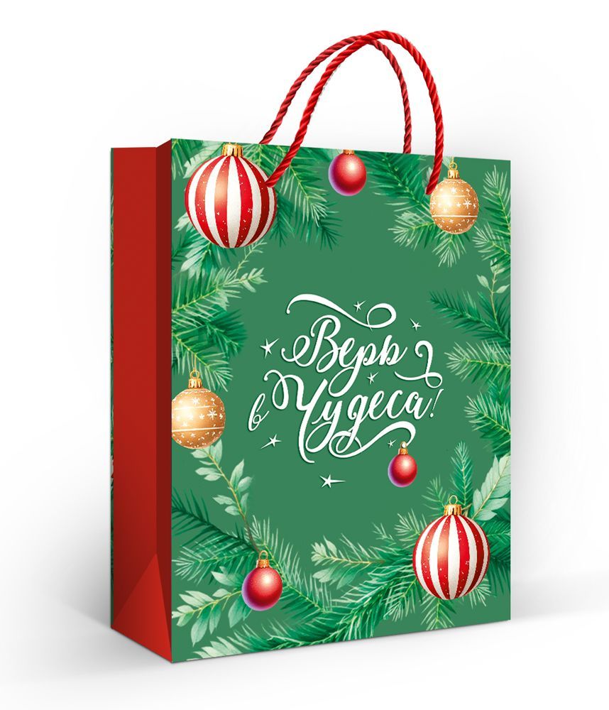 Пакет бумажный подарочный формата M изготовлен из мелованной бумаги с матовой ламинацией, что обеспечивает устойчивость к истиранию, разрывам по сгибам и сохранение печати при транспортировке и хранении. Плотная основа и ровные проклеенные швы позволяют использовать пакет для упаковки средних по весу подарков, сувенирной и промопродукции, косметики, текстиля и канцелярии. Размер готового изделия 227 × 180 мм оптимален для формирования универсального ассортимента в сезонных и постоянных коллекциях: формат удобен для выкладки на полке, штабелирования, формирования наборов и стандартных упаковочных решений. Конструкция с донышком обеспечивает устойчивое вертикальное положение пакета, что облегчает процесс упаковки на кассе и при массовой подготовке подарков. Ручки-шнуры из синтетического материала закреплены через проклеенные отверстия, выдерживают многократное использование и не деформируют верхний край. Поверхность оформлена полноцветной печатью с новогодним орнаментом: зелёный фон с еловыми ветвями, шарами и надписью «Верь в чудеса!», что делает изделие актуальным для зимних праздников, корпоративных мероприятий и розничных продаж в предновогодний период. Матовая ламинация придаёт покрытию дополнительную жёсткость, защищает от влаги и загрязнений, позволяя сохранять внешний вид при транспортировке и кратковременном хранении на складе или в торговом зале. В упаковке 10 штук, что удобно для оптовых закупок, планирования остатков и формирования однородных партий при обслуживании сетевых магазинов, подарочных сервисов и компаний, оформляющих корпоративные наборы, а также подходит для частного использования в качестве готового решения для упаковки праздничных подарков.