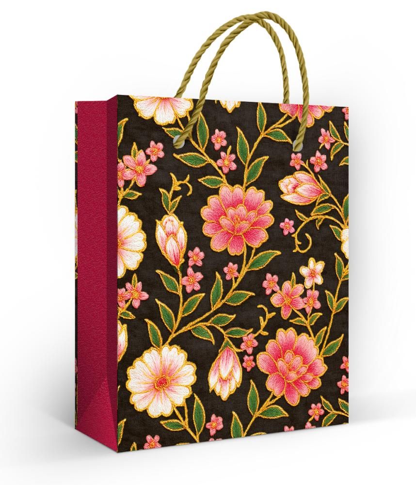 Пакет подарочный «Малиновые цветы» (S) (цветы на чёрном)