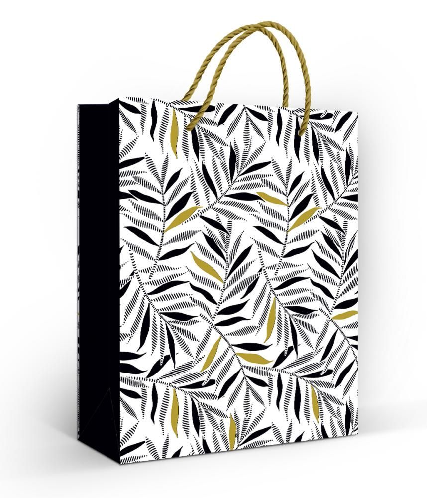 Пакет бумажный подарочный формата M изготовлен из мелованной бумаги с матовой ламинацией, что обеспечивает гладкую поверхность, устойчивость к истиранию и сохранение печати при транспортировке и хранении. Плотный материал держит форму, не деформируется при стандартных нагрузках и подходит для использования в розничной упаковке подарков, корпоративных сувениров и промопродукции. Размер готового изделия 227 × 180 мм позволяет размещать в пакете типовые наборы косметики, аксессуары, небольшие предметы одежды, книги и канцелярские наборы, что удобно при формировании унифицированного ассортимента упаковки для магазинов и интернет‑витрин. Конструкция с прочными шнуровыми ручками рассчитана на многократное поднятие и перенос относительно тяжёлых вложений без разрыва креплений; ручки комфортны при переноске на небольшие расстояния и не повреждают край пакета. Матовая ламинация дополнительно защищает изделие от влаги и загрязнений, облегчает протирку поверхности, снижает риск появления заломов и трещин по линиям сгиба при складском хранении. Декор выполнен в виде графичного растительного орнамента в чёрно‑белой гамме с акцентами золотистого цвета на белом фоне; нейтральный, но выразительный рисунок уместен для широкого круга получателей и поводов — от дней рождения и семейных праздников до деловых мероприятий, презентаций и сезонных акций. Отсутствие текста внутри и на внешних сторонах делает пакет универсальным решением для сетевого и корпоративного использования: его можно комбинировать с любыми открытками и фирменными вкладышами, применять в разных товарных категориях без изменения дизайна. Пакеты поставляются по 10 штук, что удобно для планирования оптовых закупок, формирования запасов упаковки на складе и равномерного распределения по торговым точкам.