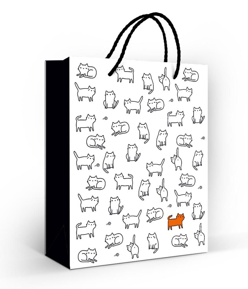 Пакет бумажный подарочный формата M изготовлен из плотной мелованной бумаги, что обеспечивает стабильную форму, аккуратный внешний вид и достаточную прочность при переноске типовых подарков среднего размера, сувенирной и сопутствующей продукции. Матовая ламинация с внешней стороны повышает износостойкость поверхности, снижает риск истирания и выцветания рисунка, а также делает пакет более устойчивым к случайным загрязнениям и влаге при кратковременном контакте. На лицевой стороне расположен повторяющийся графический принт с силуэтами котов, выполненный в минималистичном стиле с акцентом на одном элементе контрастного цвета; боковые стороны пакета однотонные, что визуально структурирует композицию и облегчает встраивание изделия в общий ассортимент упаковки. Конструкция с плоским дном позволяет пакету устойчиво стоять при выкладке на витрине и во время упаковки, а также упрощает штабелирование и хранение в складских условиях. Ручки-шнуры закреплены в верхней части через проколы и узлы, рассчитаны на многократное использование и комфортный хват, что важно при передаче покупателю более тяжёлых или объёмных вложений. Габаритные размеры готового изделия: длина 227 мм, ширина 180 мм; этого достаточно для упаковки книг, коробок с косметикой, аксессуаров, канцелярских наборов, мягких игрушек и других подарков аналогичного формата. Внутри пакет не содержит текста и дополнительных декоративных элементов, что делает его универсальным для использования в розничной торговле, корпоративных мероприятиях, тематических акциях и в качестве нейтральной подарочной упаковки на различные случаи. Поставка осуществляется по 10 штук, что удобно для планирования оптовых закупок, равномерной выкладки по торговым точкам и формирования единого визуального стиля упаковки в рамках одной коллекции.