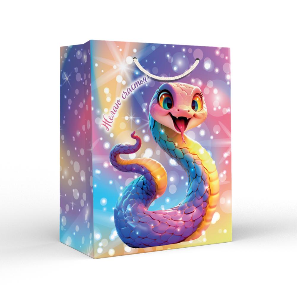 Красочный радужный подарочный пакет с символом 2025 года и надписью «Желаю счастья» подойдёт для эффектного вручения женщине или мужчине, другу или коллеге на Новый год, Рождество, любой другой праздник или без повода. Змея олицетворяет собой мудрость и возрождение, способствует пробуждению творческих сил и наполнению жизненной энергией. Изображение и фон в переливах и цветах радуги оказывают бодрящее воздействие и поднимают настроение. Красивая упаковка идеально дополнит подарок и создаст праздничную атмосферу. Пакет изготовлен из прочной мелованной бумаги, имеет удобный размер М (180х227х100 мм), что позволяет уложить в него один подарок или нескольких маленьких сувениров.