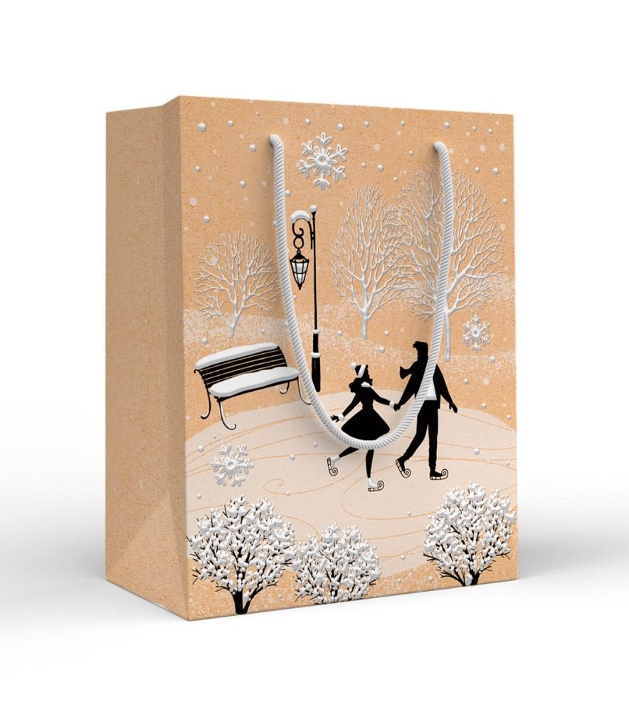 Пакет бумажный подарочный формата M предназначен для розничной и оптовой упаковки сувениров, косметики, аксессуаров и небольших наборов. Изделие изготовлено из плотной бумаги, обеспечивающей стабильную форму пакета при наполнении и устойчивость к разрывам в зоне сгибов и дна, что важно при серийном использовании в магазинах и при фасовке подарочных комплектов. Размер готового изделия 227 × 180 мм позволяет размещать внутри типовые позиции среднего формата, при этом пакет не занимает лишнего места при транспортировке и хранении на складе. Конструкция дополнена фигурной вырубкой, формирующей аккуратный верхний край и придающей изделию законченный внешний вид, что удобно для использования пакета как готового решения без дополнительной обёртки. Ручки выполнены из шнура с мягкой структурой, комфортной для переноса даже при максимальной загрузке по объёму пакета; крепление рассчитано на многократное использование при выдаче подарков в торговых точках и на мероприятиях. Внешняя поверхность имеет отделку пластизолем с блёстками, за счёт чего рисунок с зимним парком, фигуристами, заснеженными деревьями и скамейкой приобретает рельеф и устойчив к истиранию при контакте с руками и соседними упаковками. Такое оформление подходит для новогодних и зимних акций, корпоративных наборов, упаковки подарков для клиентов и персонала, а также для частного использования при подготовке праздничных презентов. Пакеты поставляются по 10 штук, что удобно для планирования закупок, формирования запасов по сезону и равномерного распределения по торговым точкам или отделам. Бумажная основа облегчает утилизацию после использования и не требует специальных условий хранения: достаточно поддерживать сухое помещение и избегать прямого длительного воздействия влаги, что позволяет хранить партию до следующего сезона без потери потребительских свойств.