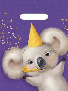 Полиэтиленовый подарочный пакет с праздничной коалой. Яркие цвета и любимый зверек – залог идеальной упаковки для подарка!