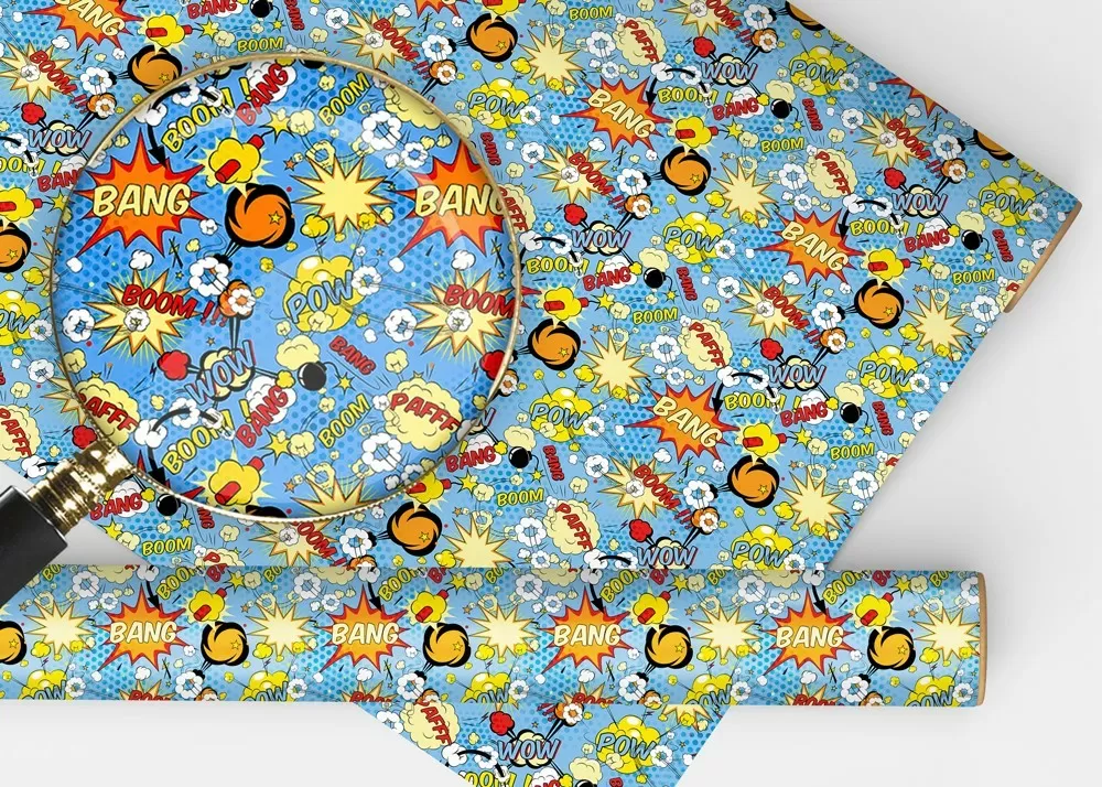 Яркая упаковочная бумага с облачками взрыва и надписями в стиле комиксов на голубом фоне придаст оригинальности любому презенту. Рисунок нанесен с одной стороны. Бумагу можно использовать для оформления конфет, букетов, подарочных композиций и наборов. Благодаря оптимальному размеру 70х100 см получится завернуть один большой подарок или несколько маленьких. Свежий дизайн порадует взрослого или ребенка на день рождения, свадьбу или другой праздник. Часто для корпоративных подарков необходим единый стиль оформления, поэтому приобретается упаковочная бумага оптом. Также красочная обертка послужит хорошим материалом для поделок.