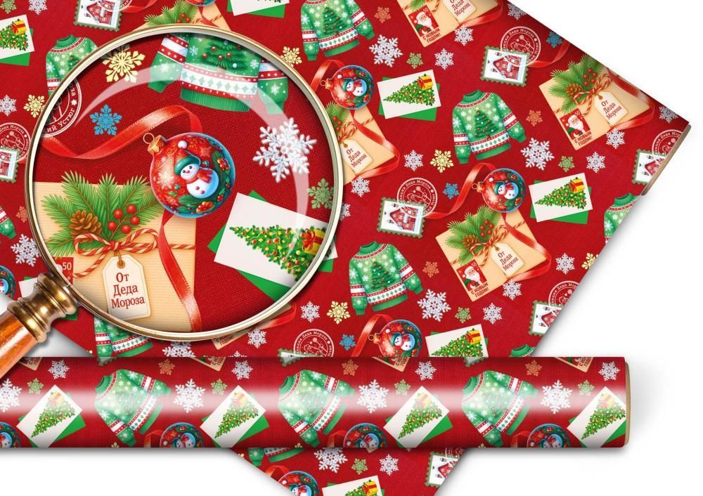 Упаковочная бумага формата А1 изготовлена из мелованной бумаги с плотной, однородной структурой, что обеспечивает стабильное качество при оптовых поставках и удобство механизированной или ручной упаковки. Размер готового изделия 974 × 674 мм позволяет использовать лист для оформления как средних, так и крупных подарочных коробок, а также для групповой упаковки однотипной продукции на розничных точках. Поверхность покрыта глянцевым ВД-лаком, за счет чего рисунок с новогодней тематикой на красном фоне выглядит более насыщенным и устойчив к истиранию при транспортировке, складском хранении и выкладке. Лаковый слой снижает риск смазывания краски и повышает стойкость к случайным загрязнениям, что важно при поточном упаковывании подарков в магазинах, на ярмарках и в сервисах подарочной упаковки. Плотность и гладкость мелованного материала облегчают формирование четких сгибов по краям коробок, бумага не рвется при аккуратном натяжении и хорошо держит форму, что удобно как для профессиональных упаковщиков, так и для домашнего использования. Новогодний рисунок с изображениями праздничных свитеров, открыток с елкой, шаров и конвертов создает единый стилистический ряд, подходящий для сезонных коллекций, оформления корпоративных подарков, детских наборов и тематических витрин. Листовой формат удобен для хранения в стопах и транспортировки без значительных повреждений кромок, что снижает отходы при массовой упаковке. Бумага совместима с большинством стандартных лент, декоративных шнуров и наклеек, не требует специальных условий применения, может использоваться для упаковки подарков, оформления коробов с сувенирной продукцией, декорирования полок и витрин к новогоднему сезону. Количество в упаковке: 1.