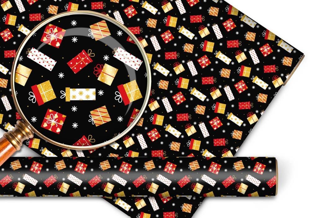 Упаковочная бумага формата А1 изготовлена из мелованной бумаги с гладкой, однородной поверхностью, обеспечивающей стабильное качество печати и аккуратный внешний вид готовой упаковки. Размер листа 974 × 674 мм позволяет использовать изделие как для единичной, так и для серийной упаковки средних и крупных подарков, удобно раскраивать и комбинировать в витринных выкладках. На лицевой стороне нанесен полноцветный праздничный рисунок с изображением подарочных коробок на темном фоне; дизайн нейтрален по тематике и подходит для новогодних, рождественских и других календарных и корпоративных праздников, что упрощает планирование ассортимента для оптовых закупок. Материал имеет оптимальную плотность для сохранения формы при заворачивании, не рвется при стандартных нагрузках, хорошо держит сгиб и складку, что важно при поточном упаковывании на кассовых зонах и в отделах подарочной упаковки. Глянцевый ВД-лак по всей поверхности усиливает насыщенность цветов, придает покрытию дополнительную износостойкость и устойчивость к истиранию, уменьшает риск загрязнений при контакте с руками и товарами, облегчает хранение и транспортировку в стопках или рулонах. Отсутствие текста внутри делает бумагу универсальной для розничной продажи, использования в сервисах упаковки, рекламных и промо-наборах. Лист можно применять не только для оформления подарков, но и для декоративного оформления витрин, выкладки сезонных коллекций, изготовления несложных упаковочных элементов и подложек. В упаковке 1 изделие, что удобно для тестовых закупок, формирования смешанных витринных ассортиментов и розничной продажи поштучно.