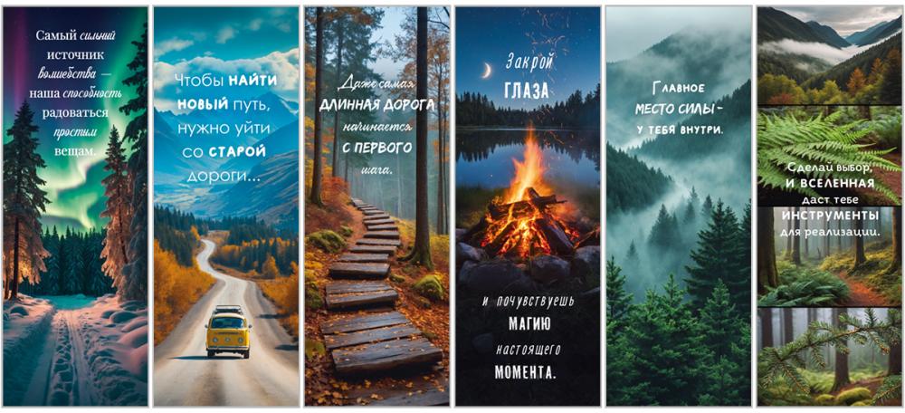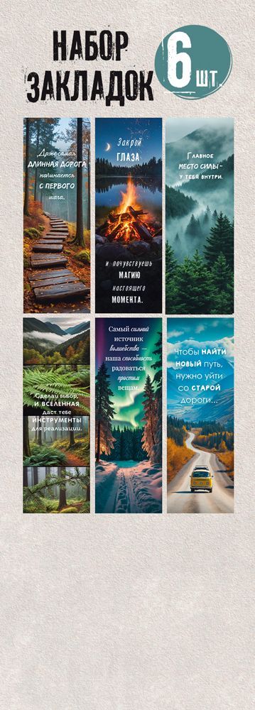 Набор закладок формата А6 представляет собой комплект из 6 отдельных элементов из плотного картона прямоугольной формы размером 160 × 55 мм. Картон обеспечивает достаточную жесткость, устойчивость к сгибам и истиранию при регулярном использовании в книгах, ежедневниках и рабочих блокнотах, что важно при формировании ассортимента для учебных заведений, офисных и книжных магазинов. Поверхность без дополнительной отделки имеет умеренно гладкую фактуру, удобную для тактильного контакта и не создающую бликов при искусственном освещении, что облегчает чтение нанесенного текста. На каждой закладке размещено полноцветное изображение с природными пейзажами и мотивирующими надписями, напечатанными контрастным шрифтом, хорошо различимым на расстоянии и при разном уровне освещенности. Цветопередача устойчива к выцветанию при стандартных условиях эксплуатации в помещении, что позволяет закладкам сохранять внешний вид при длительном нахождении между страницами и многократном перелистывании. Компактный формат и унифицированные размеры всех элементов удобны для складского хранения, фасовки и транспортировки крупными партиями, а также для выкладки в прикассовой зоне или на стойках с сопутствующими товарами. Нейтральная тематическая направленность изображений и универсальный текст делают набор применимым как в учебном процессе, так и в деловой среде или домашнем использовании: закладки подходят для фиксации нужной страницы, тематического разделения материалов, визуального зонирования записей. В одной упаковке 1 набор, что позволяет гибко формировать оптовые поставки, комплектовать подарочные и канцелярские наборы, а также использовать товар как дополнение к книгам, блокнотам и планерам без необходимости дополнительной подготовки или доукомплектации.