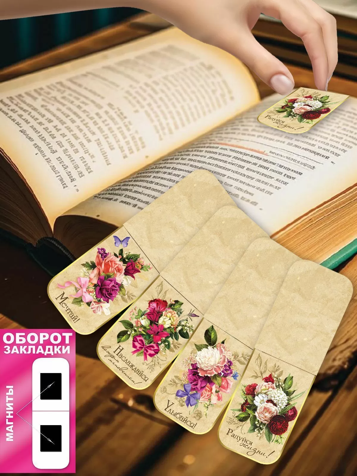 Набор из 4-х картонных закладок с приклеенным внутри виниловым магнитом. Размер закладок в сложенном виде - 36х54.
