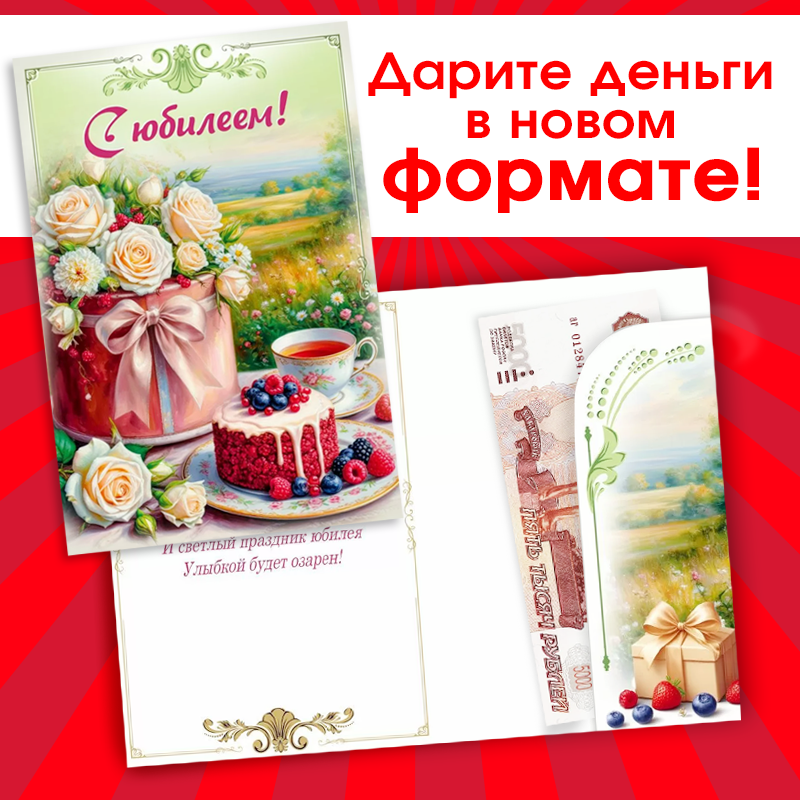 Внутри открытки есть замечательные стихи с теплыми пожеланиями и специальный карман для денег, в который удобно помещается купюра любого номинала.