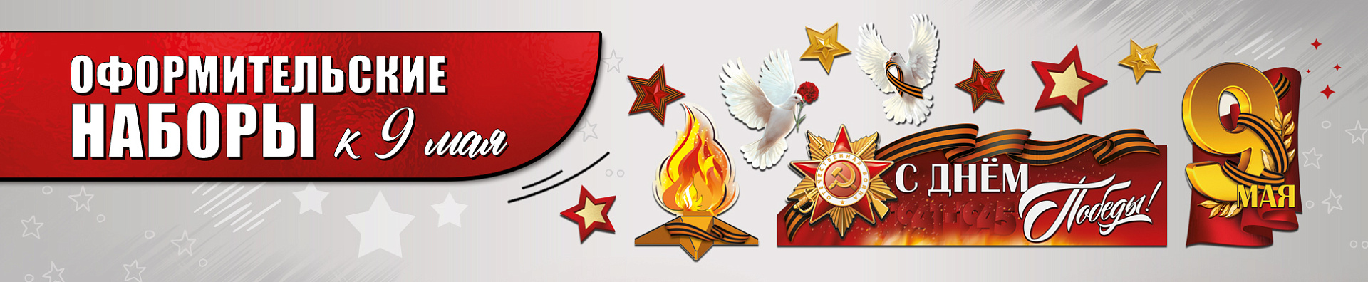 В наборах уже есть всё необходимое: тематические плакаты, декоративные элементы, звезды, голуби мира, гвоздики, символика Победы и фигурные композиции. Вам не нужно подбирать детали — просто откройте набор и оформите помещение за считанные минуты.